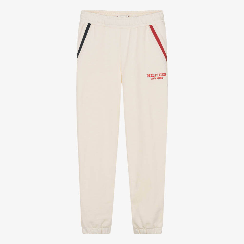 Ivory joggers for teen girls by Tommy Hilfiger, with an embroidered logo on the front for a distinctive designer look. These comfortable joggers are made in soft, mid-weight cotton jersey and have the brand's signature colours detailed on the slanted pockets. For a good fit, the elasticated waistband has an inner drawstring and the iconic flag logo on the back gives an extra branded touch to this sporty, casual style.
