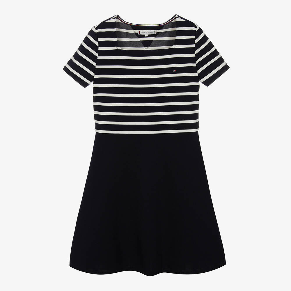 For teen girls, a navy blue and ivory striped dress from American brand Tommy Hilfiger with the iconic flag logo embroidered on the chest. With a square neckline and flared A-line skirt, this soft cotton jersey dress is casual and easy to wear.