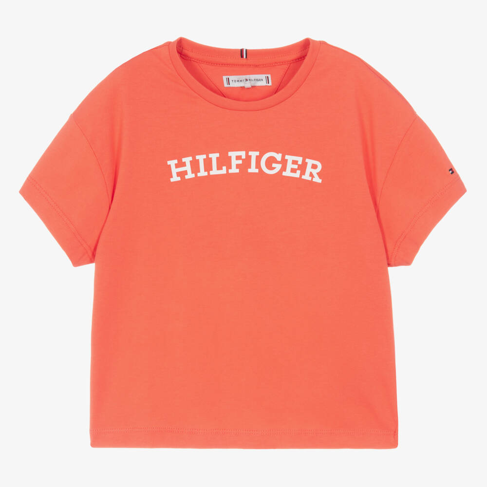 Coral-pink cotton T-shirt for teen girls from Tommy Hilfiger, in a cool boxy fit. An unmistakable design from the American label, a white rubberised logo can be found on the front, the signature flag is embroidered on the sleeve and a tricolour tab is stitched on the back of the neckline. It is made in soft and stretchy jersey for comfortable wear.