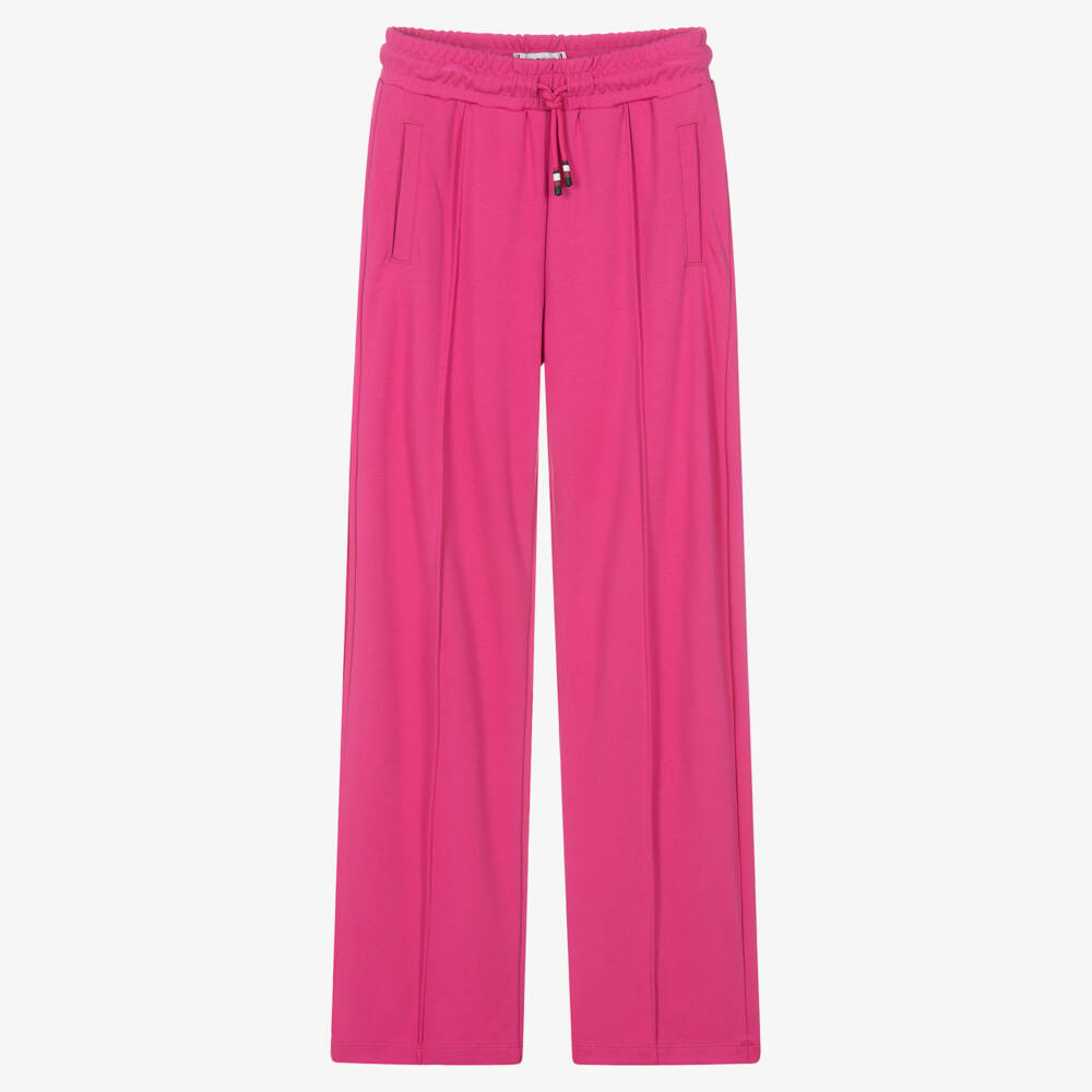 Magenta pink joggers for teen girls by Tommy Hilfiger, with a wide leg silhouette and seams on the front and back. Made in a soft and stretchy viscose blend, these casual trousers have an elasticated waistband with signature detailing on the drawstring caps. Great for a laid-back look, they have pockets on the front and a small flag logo embroidered on the back. This product is made with at least 50% FSC certified viscose.