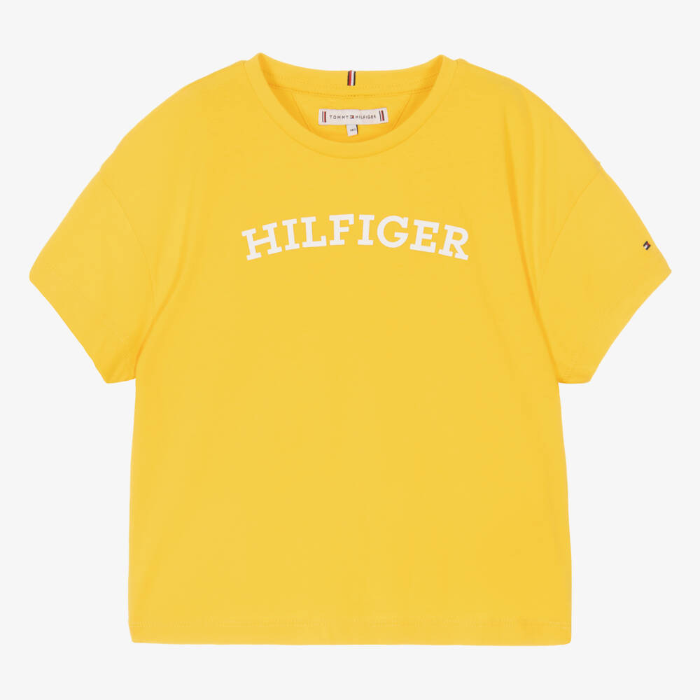 Vibrant-yellow cotton T-shirt for teen girls from Tommy Hilfiger, in a cool boxy fit. An unmistakable design from the American label, a white rubberised logo can be found on the front, the signature flag is embroidered on the sleeve and a tricolour tab is stitched on the back of the neckline. It is made in soft and stretchy jersey for comfortable wear.