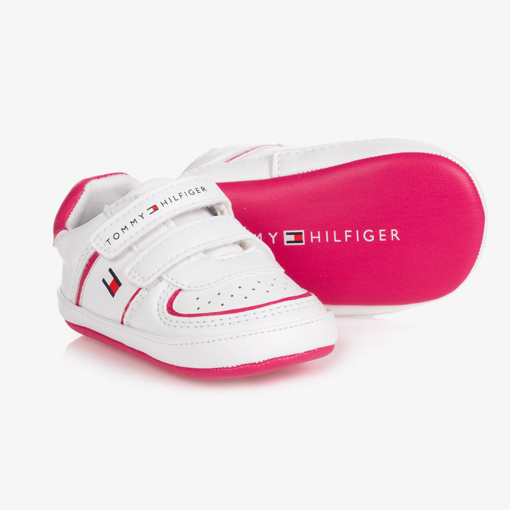 White pre-walker trainers for baby girl by Tommy Hilfiger. Made in soft faux leather with a textile lining, they have velcro straps, one of which has a logo print. They are trimmed with bright pink detailing and the brand's red, white and navy blue flag is printed on the side. They have a perforated toe and pink flexible sole.