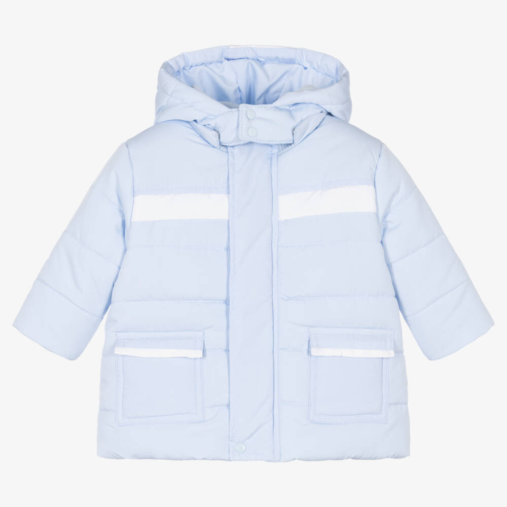 Lovely pale blue puffer coat for little boys by Tutto Piccolo, with contrasting white trims. Silky smooth, it has a cosy polar fleece lining and is softly padded for warmth. The hood is detachable and fastens with poppers under the chin. Zip fastening, the coat has internal ribbed cuffs and a popper fastening storm flap to help keep out chilly winds. The neckline is ribbed for a snug feel and there are useful flap pockets on the front.