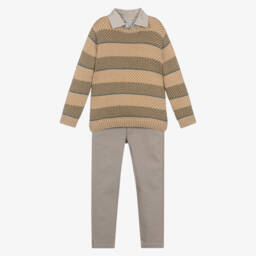 In complementary shades of muted green and beige, this jumper and trouser set for boys is from Tutto Piccolo. The cotton-blend long-sleeved jumper is softly knitted with an ivory, striped design and has button fastenings on the raglan seams. The coordinating trousers are softly woven with a fine beige and ivory pattern and lined in soft jersey for comfort. Styled with slanted front pockets, they have a gently elasticated waistband with a decorative tie detail on the front.