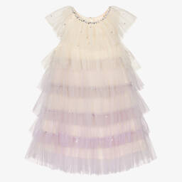 A magical pale blue dress for girls by Tutu du Monde, ideal for weddings and other special occasions. The high neckline and the tulle fabric are sprinkled with iridescent disc sequins that sparkle when they catch the light. It has sheer flutter sleeves and a dramatic hem layered with feathered tulle petals for beautiful volume. A keyhole button fastening adds classic detail on the back.