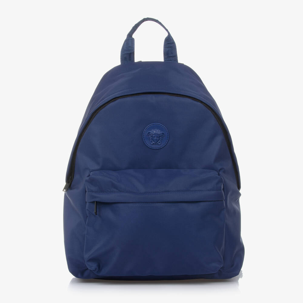 Royal blue backpack for boys by luxury Italian brand Versace, made in silky smooth fabric, with black leather trims. The spacious main compartment has a slip pocket inside, ideal for a laptop and fastens with a zip across the top. There is a zipped pocket on the front and a useful carry handle with a jacquard Greca pattern. The back is made of breathable mesh and is padded for comfort and the shoulder straps are adjustable. For a statement designer finish, this lightweight bag has a blue rubberised Medusa logo on the front.