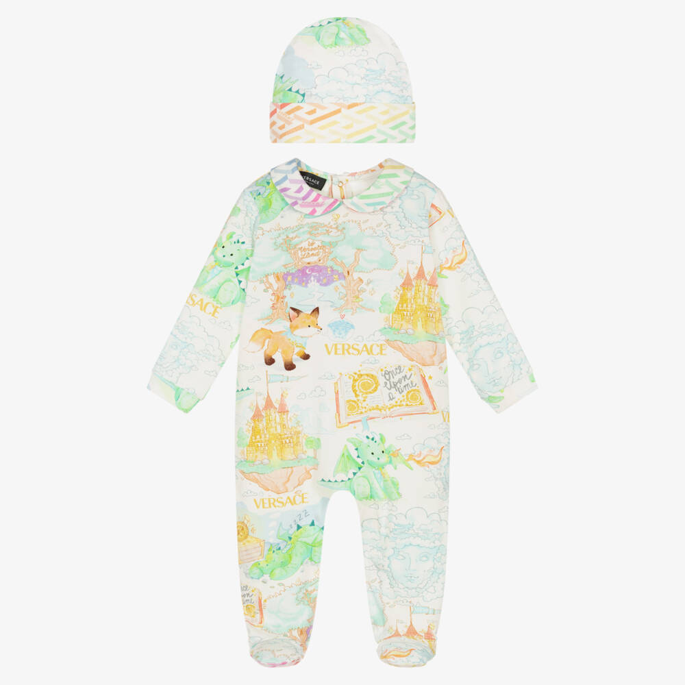 Adorable babygrow and hat gift set for boys by Versace, made in luxury soft ivory cotton jersey. In a soft pastel blue colour palette, the all-over Versace Storybook print is depicting a once upon a time fairytale village with sleepy dragons and cute Medusa clouds. The hat has a turn-up brim and lining in La Greca Signature print to match the accent collar on the popper fastening babygrow. Ideal for gifting, the set is presented in a branded box.