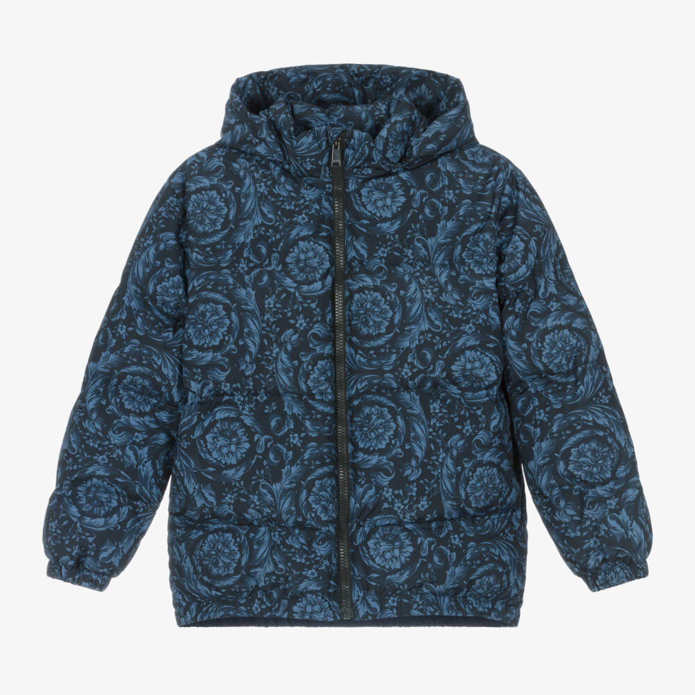 A blue puffer jacket for boys by renowned Italian label Versace, padded with luxuriously soft down. Silky smooth, it is patterned with the iconic Barocco print for a cool designer look. The removable hood attaches with a zip, allowing for different looks. The elasticated cuffs and hem help keep him warm in cold weather. The hidden side pockets are lined with cotton twill for comfort and the front secures with a branded zip.