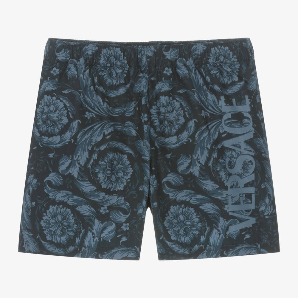 Navy blue swim shorts for boys by luxury brand Versace, beautifully patterned with the designer's instantly recognisable Barocco print in shades of blue. Silky and lightweight with a stretchy jersey lining and a comfortable elasticated waistband, they have a patch pocket with eyelet detail on the back. A tonal logo print on one leg completes the designer look.