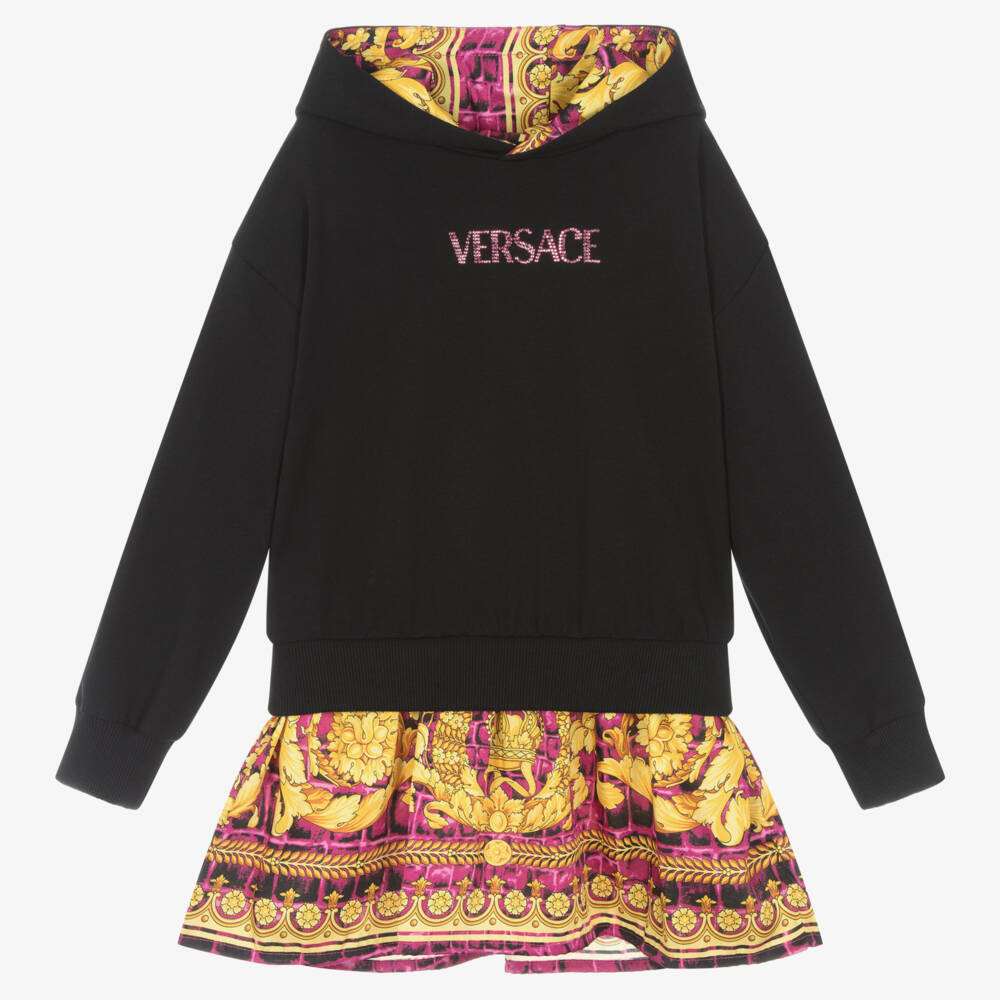 Black layered and hooded sweatshirt dress for girls by luxury Italian designer Versace, as seen in the main collection. For instant designer appeal, it is trimmed with satin twill on the hood and skirt, in fuchsia pink and gold Barocco crocodile print. Comfortable and relaxed, the dress has dropped shoulders and ribbing detail on the cuffs and hem. Completing the designer look, there is a sparkly pink diamanté logo across the front.