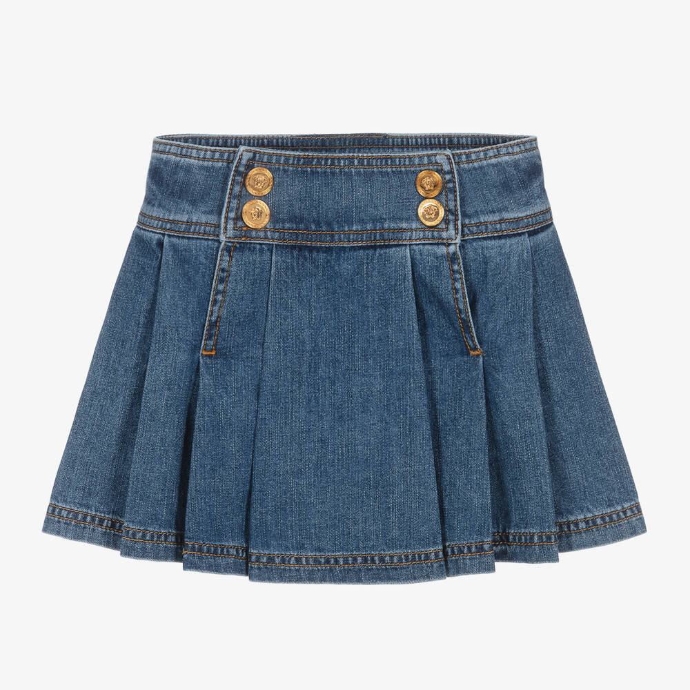 Short blue cotton denim skirt for girls unmistakeably by luxury Italian designer Versace, with shout-out, shiny gold Medusa-embossed popper fastenings on the front. With a casual, washed and worn look, it has a deep, adjustable waistband for a comfortable fit and fun, flippy pleats below.