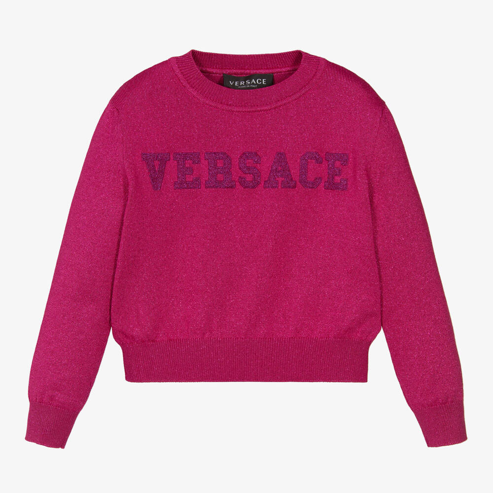 Fuchsia pink sweater for girls by luxury Italian brand Versace, made in a soft and lightweight knit, with a pink glitter thread adding a lovely touch of sparkle. Casually designed with a crew neck and lightly ribbed cuffs and hem, it has the designer's name embroidered on the front for instant brand recognition.
