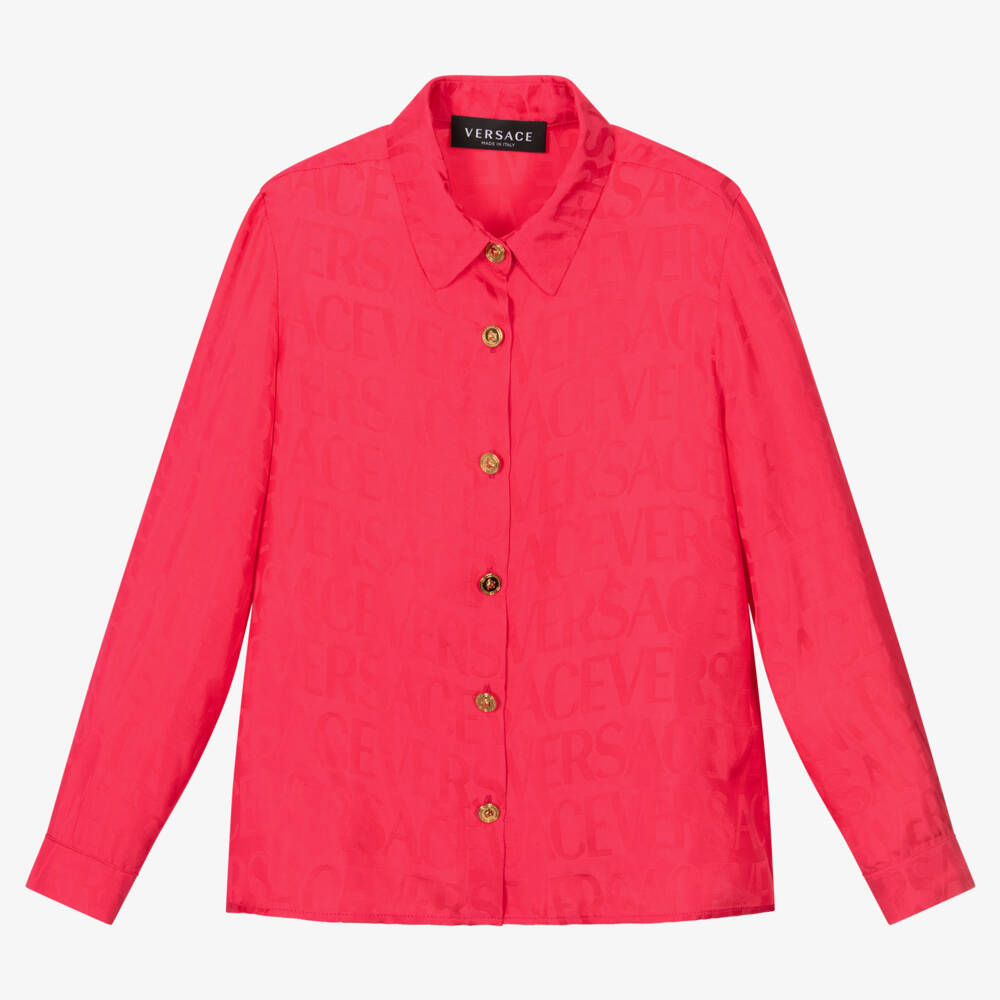 In bright fuchsia pink, this gorgeous satin jacquard shirt for girls is by luxury Italian brand Versace. Silky soft with a beautiful drape, it features an all-over tonal logo print and elegant gold Medusa buttons for an unmistakable designer look.