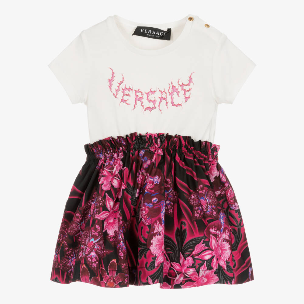 Pretty white and pink dress for little girls by luxury brand Versace. Styled to look like a T-shirt tucked into a skirt, this sweet dress is made in soft cotton for a comfortable fit. Undeniably Versace, the white jersey top is printed with a flaming logo and fastens with Greca embossed poppers on one shoulder for fuss-free dressing. The skirt is patterned with orchid Barocco print for an eye-catching finish.