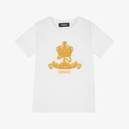 تيشيرت أوف وايت للأولاد من ماركة فيرساتشي الفاخرة، يتميز بطبعة شعار التاج الذهبي المميز على الصدر. يتميز بالراحة والأناقة، مصنوع من قماش قطن جيرسي ناعم ومصمم برقبة دائرية.