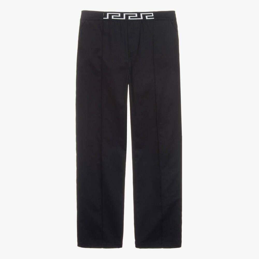 From luxury Italian brand Versace, these navy blue trousers for teen boys, have the designer's distinctive Greca trim on the front. Both comfortable and stylish, they are made in smooth cotton twill, with a partially elasticated waistband. Seams on the front and slanted pockets complete the smart look.