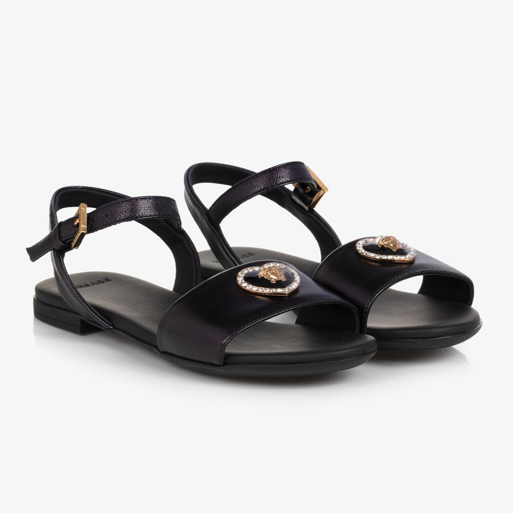 Black leather sandals for teen girls by luxury Italian designer Versace. A sleek open-toe design, they are decorated with a heart-shaped Medusa logo plaque on the front strap. The surrounding diamanté embellishment adds extra sparkle. The adjustable gold buckle fastenings on the ankle are finished with Greca-engraved detailing for further distinction. They have a lightly padded leather inner sole and non-slip rubber soles for improved grip.