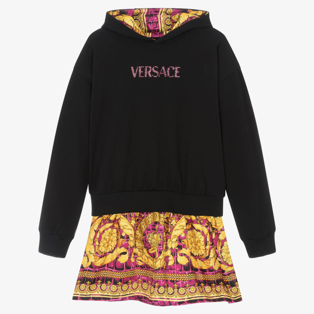 Black Versace sweatshirt dress for teen girls, with the luxury Italian designer's fuchsia pink and gold Barocco crocodile pattern on the satin twill hood lining and skirt. For added designer appeal, there is a sparkly pink diamanté logo across the front. Inspired by the main collection, this comfortable, layered style has a relaxed fit with dropped shoulders and ribbed trims. It is made in soft cotton jersey for everyday comfort.