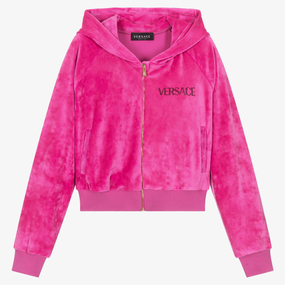 Stylishly casual, this bright fuchsia pink hooded zip-up top for teen girls is by luxury Italian brand, Versace. For a sparkly signature look, there is a Versace logo and a large Medusa motif on the back, both are made from tiny black studs. It fastens with a golden zip on the front with a Medusa logo on the zip pull for an added designer finish. So cosy, it is made in beautifully soft and stretchy velour with front pockets and ribbed trims.