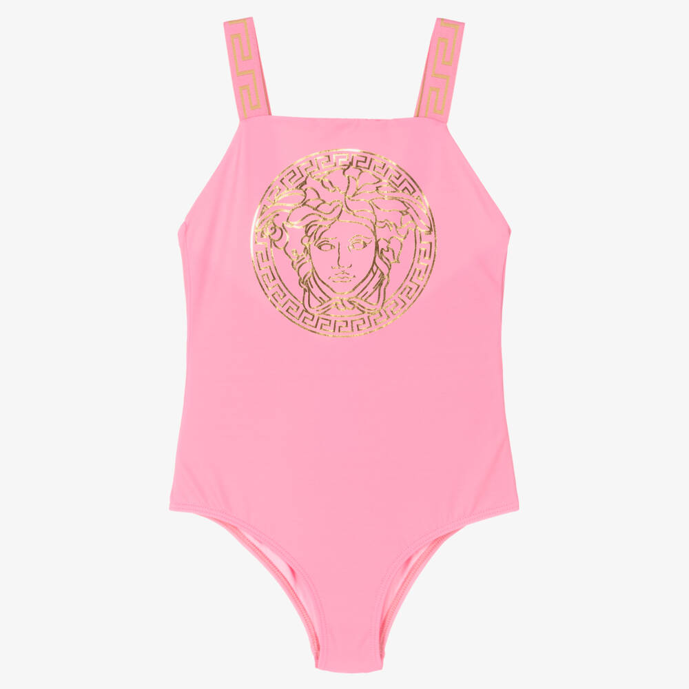 A vibrant pink swimsuit for teen girls by luxury Italian designer Versace, with a gold foil Medusa print on the front. Silky and stretchy, this instantly recognisable swimsuit is finished with the signature Greca border on the shoulder straps in gold. It is fully lined for ultimate comfort.