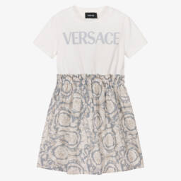 Inspired by the adult collection, this white and pink dress for teen girls is from luxury fashion house Versace. A vivid floral design is patterned on the silky ruffle skirt, which is defined by the designer's instantly recognisable Greca logo. The cotton jersey T-shirt bodice has a bright pink logo printed on the front, with dropped shoulders for a casual finish.