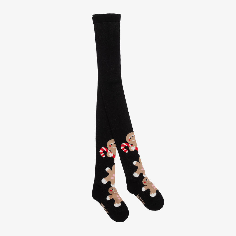 Black marled tights for girls by Wauw Capow, made in a soft organic cotton blend. Great for outfitting, these fun tights are detailed with beige gingerbread cookies and red striped candy canes on each leg. They have plenty of stretch for a comfortable fit and feel.