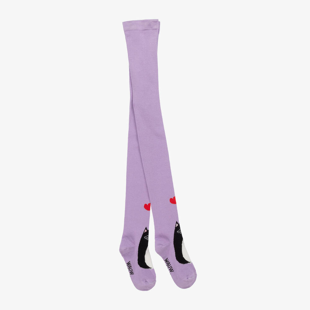 Purple tights for girls by Wauw Capow, made in a soft organic cotton blend with fine ribbing. Great for outfitting, these playful tights are detailed with cute black and white cats, and red love hearts. They have plenty of stretch for a comfortable fit and feel.