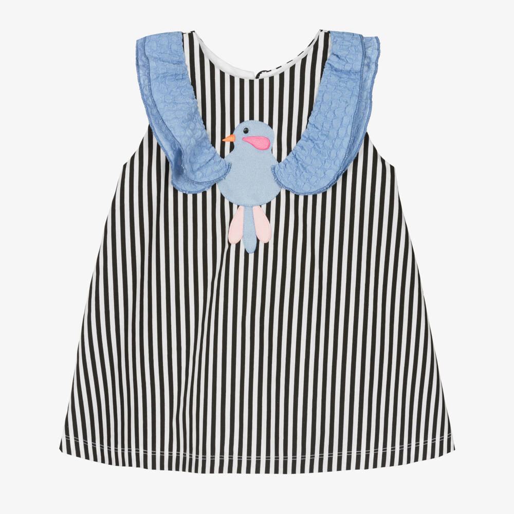In monochromatic stripes, this black and white woven dress for girls is from Wauw Capow by Bangbang. A cute blue bird is patched onto the front, with textured ruffle trims for a quirky, whimsical style. It fastens with a keyhole button, and is comfortably lined in soft voile.