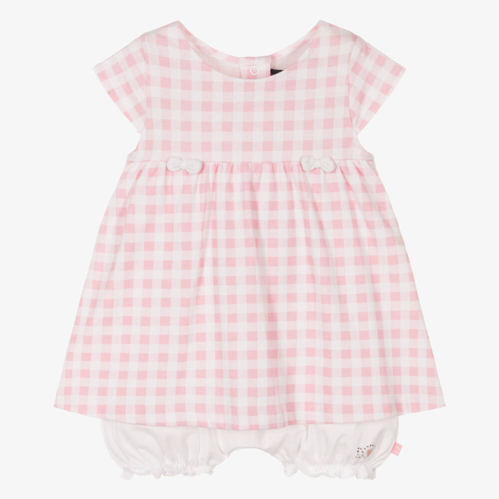 Pink and white gingham dress for baby girls by French designer Week-end à la mer, made in a soft, comfortable cotton jersey. For comfort and easy dressing, it has attached bloomers with popper fastenings between the legs. There are beautiful bows on the front, with a pink embroidered heart and diamanté fish logo on one leg. This cute dress has easy fastening poppers on the back.