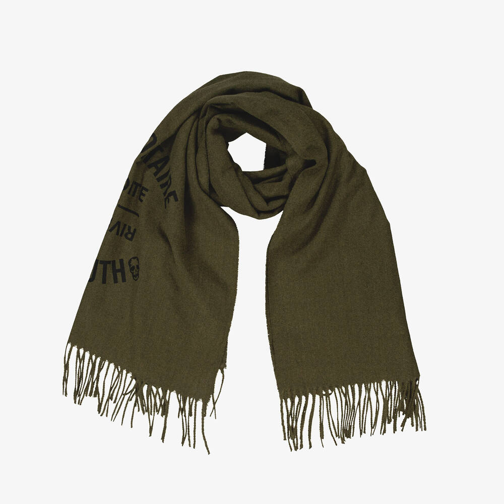 Khaki green scarf for girls by French brand Zadig & Voltaire, with the designer's black insignia logo and signature skull motif printed on one end. Just right for keeping both stylish and warm, it is made in a super soft and cosy viscose blend with fringing.