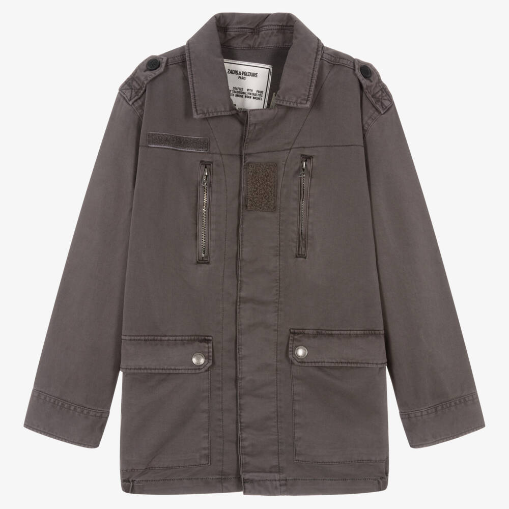 As seen in the main collection, a dark grey military jacket for teen boys by Zadig&Voltaire. In collaboration with illustrator Core Cho, this detailed jacket has an embroidered skateboard design on the back featuring a winged skull motif and the peace symbol. Made in soft cotton twill, it has a partially elasticated hem for added comfort, with concealed buttons down the front. There are shoulder tabs, flap and zip pockets, and logo embossed hardware for extra branding.