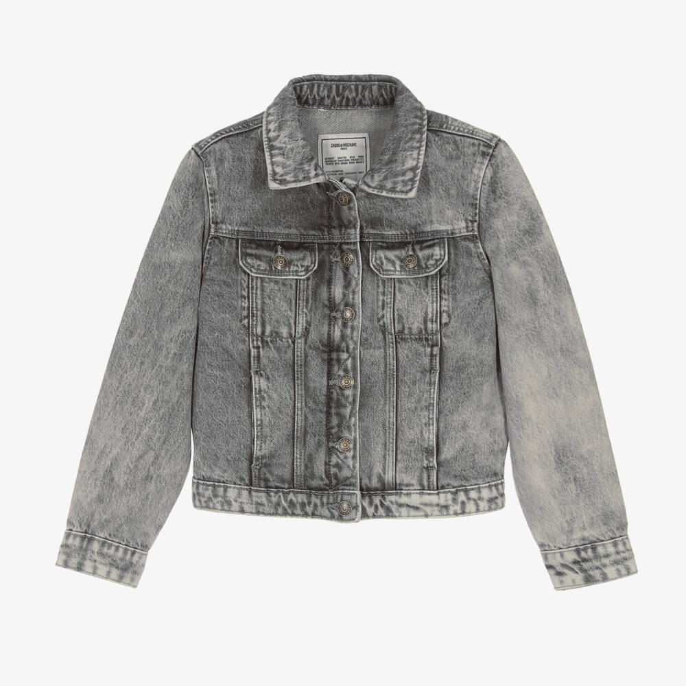 Inspired by the womenswear collection, this grey denim jacket for teen girls is from Zadig&Voltaire. It is styled in a washed design for a distressed look, and has a rustic green logo printed on the back for bold distinction. A guitar is creatively pictured beneath, with embroidered flowers and a 'Art is truth' slogan. There is a tan brown logo patch on the hem. The brass logo-embossed button and zip fastening, and four-pocket styling add a casual finishing touch.