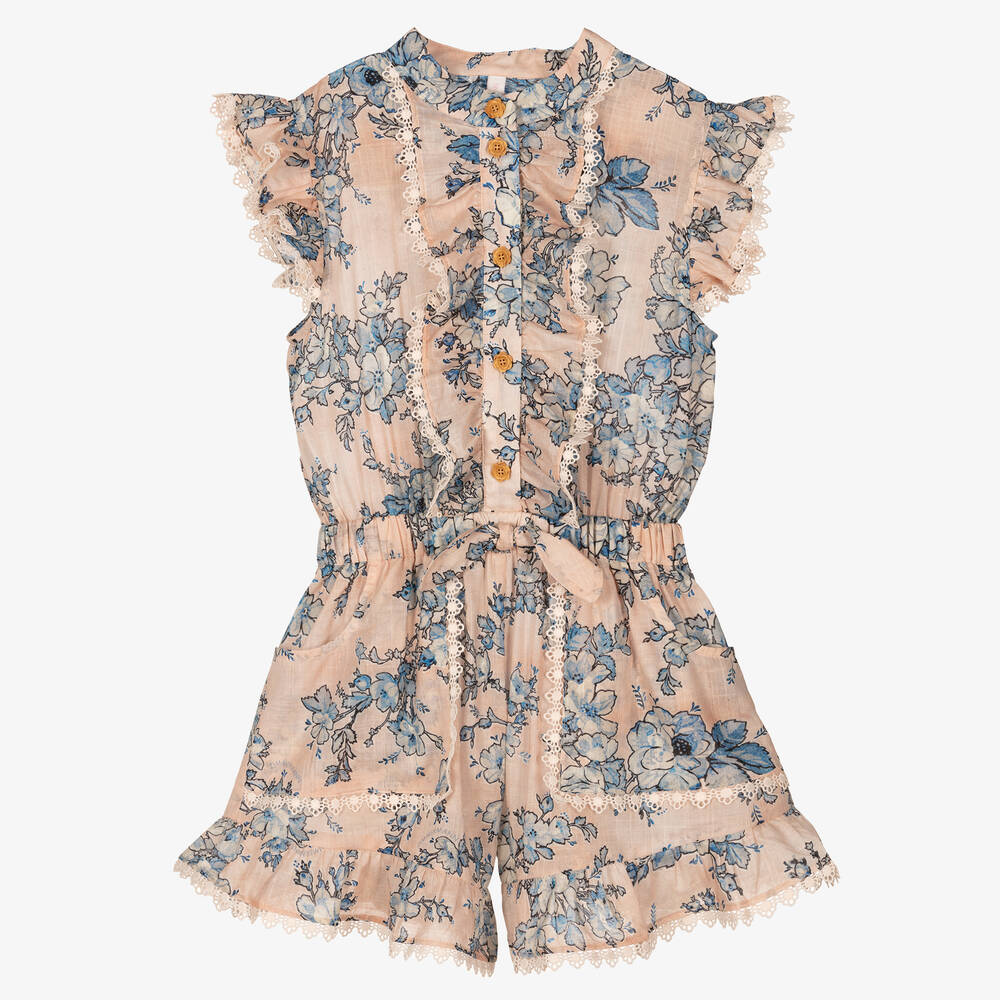 Beautiful floral playsuit for girls by luxury brand Zimmermann, in a pretty pastel pink and blue colour palette. Trimmed with delicate guipure lace, it has flutter sleeves and an elasticated waist with a tie-up bow. It fastens with flower-shaped buttons on the front, and is ideal as a cover-up at the resort or as a stylish look on sunny days.