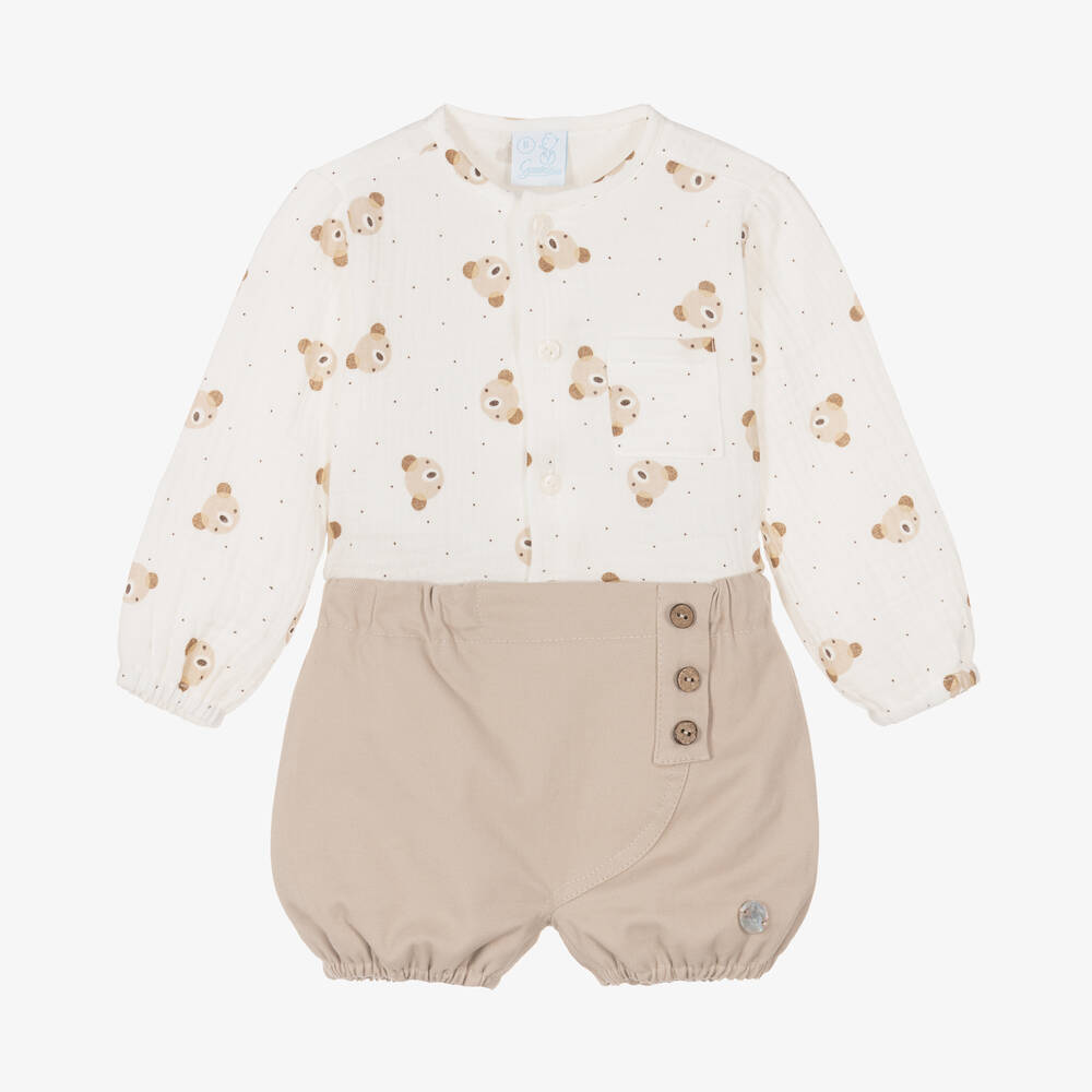A charming ivory and beige cotton shorts set for baby boys by Artesanía Granlei. Made in beautifully soft muslin, the long-sleeved top is patterned with cute teddy bears. It has stretchy cuffs, a little chest pocket and front button fastenings. Completing the look, the fully lined shorts have decorative wooden buttons and elasticated cuffs for a classic look. The elasticated waistband can be easily adjusted for an ideal fit. Both pieces are trimmed with the brand's mother-of-pearl logo charm for designer appeal.