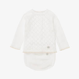 White shorts set for baby boys by Artesanía Granlei, finely knitted in a soft cotton blend. This sweet, traditional outfit includes a long-sleeved top with an openwork diamond pattern on the front, beige picot trims and neat button fastenings. The matching shorts are gently elasticated for easy dressing. Both pieces feature the brand's signature mother-of-pearl logo charm.