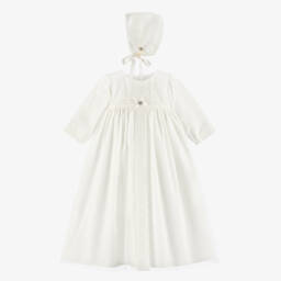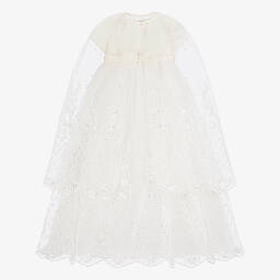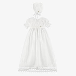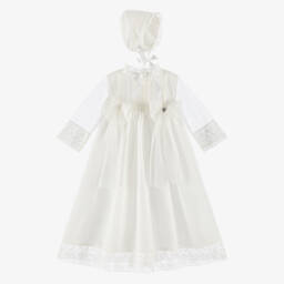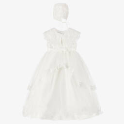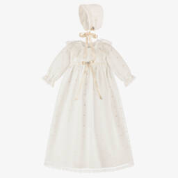 Beautiful pale beige ceremony dress and bonnet set for baby girls by Artesanía Granlei. Elegant for special occasions, this outfit is made from delicate tulle with intricate ivory floral embroidery and lace trims for a traditional look. The dress fastens neatly on the back with buttons and the bonnet ties with satin ribbons. Both have a soft organic cotton lining for comfort.