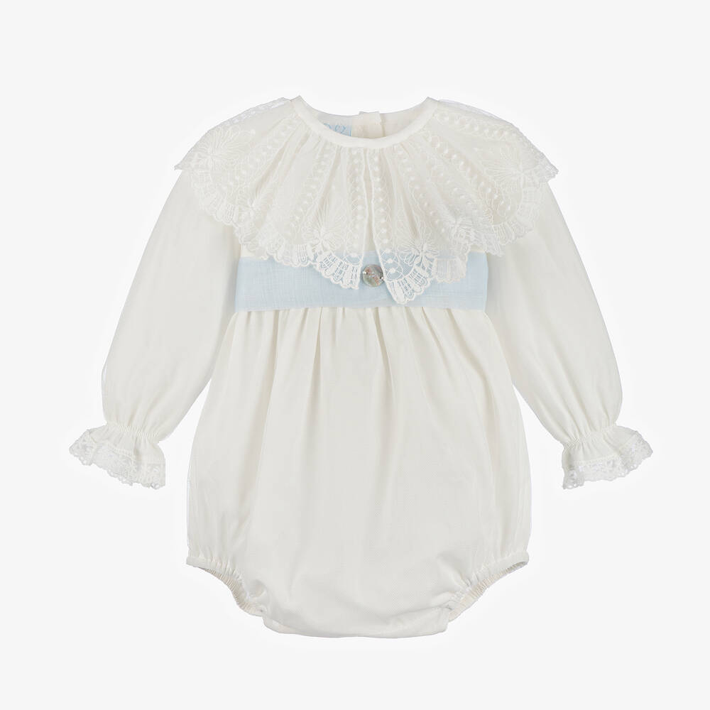 A lovely ivory shortie for baby girls by Artesanía Granlei. Made from lightweight tulle with a smooth woven lining. It has a delightful embroidered tulle collar with matching trims on the elasticated cuffs of the long sleeves. Ideal for special occasions, it has a pale blue fixed sash belt that is stitched with a faux mother-of-pearl logo charm on the front and secures into a charming bow on the back. It has button fastenings on the back and between the legs for a neat finish.