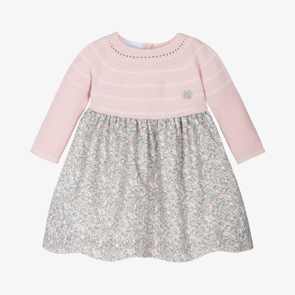 A delightful pale pink dress for baby girls by Artesanía Granlei. Made from a soft knit, the long-sleeved bodice has a fine white striped design with openwork detailing around the neckline. Fastening with pearlescent buttons on the back, there is a faux mother-of-pearl logo charm on the front for an added touch of branding. The smooth cotton twill skirt has a pretty floral pattern and a lightweight cotton-blended lining for extra comfort.