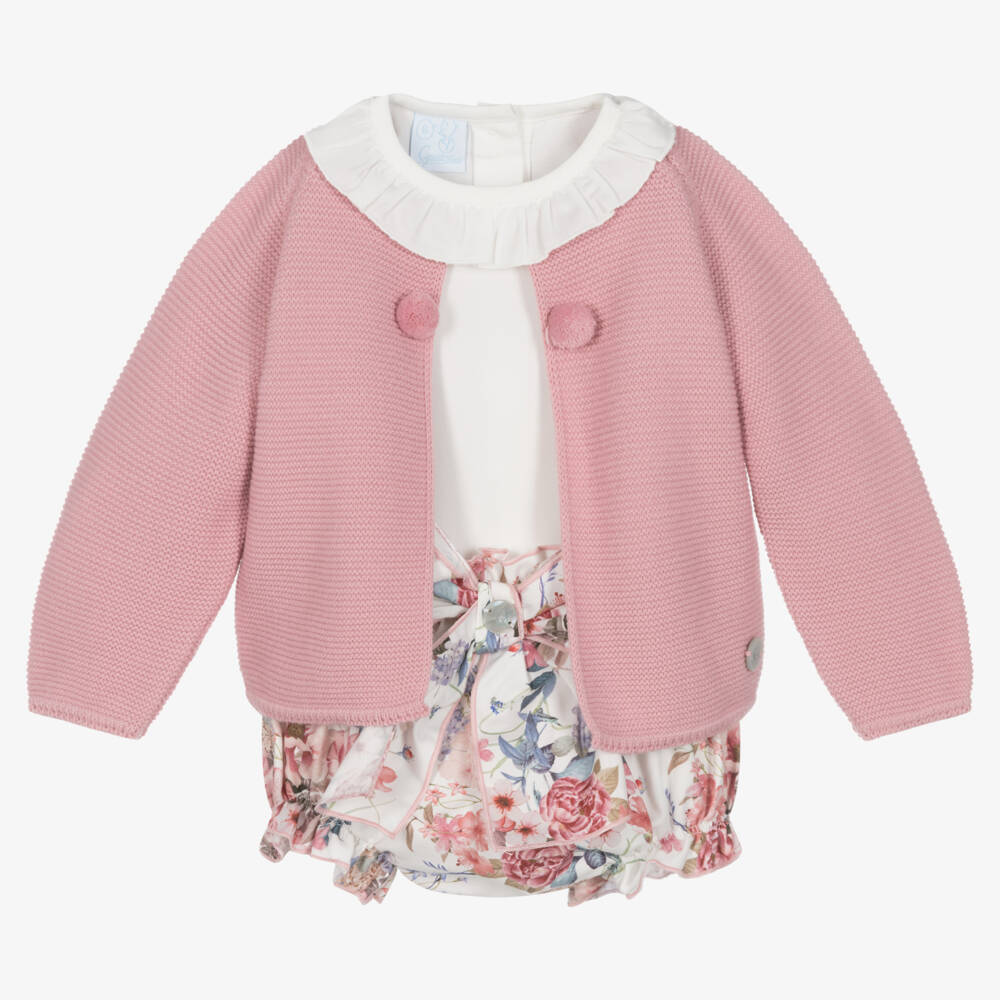 A delightful shorts set for baby girls by Spanish brand Artesanía Granlei. The pink cardigan is knitted in soft acrylic, with sweet pom-pom detailing and a concealed button fastening on the front. The pale ivory twill blouse has a feminine ruffle collar, elasticated cuffs and back button fastenings. Patterned in a beautiful floral print, the cotton twill shorts have a pretty bow on the front, with elasticated ruffle trims.