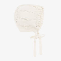 Sweet beige bonnet for baby boys and girls from Spanish brand, Artesanía Granlei. It is softly knitted with pretty cable detail, scalloped trim, and a lovely floral pattern on the crown. There are knitted ties to fasten under the chin for a secure fit, with the signature mother-of-pearl logo charm to finish.