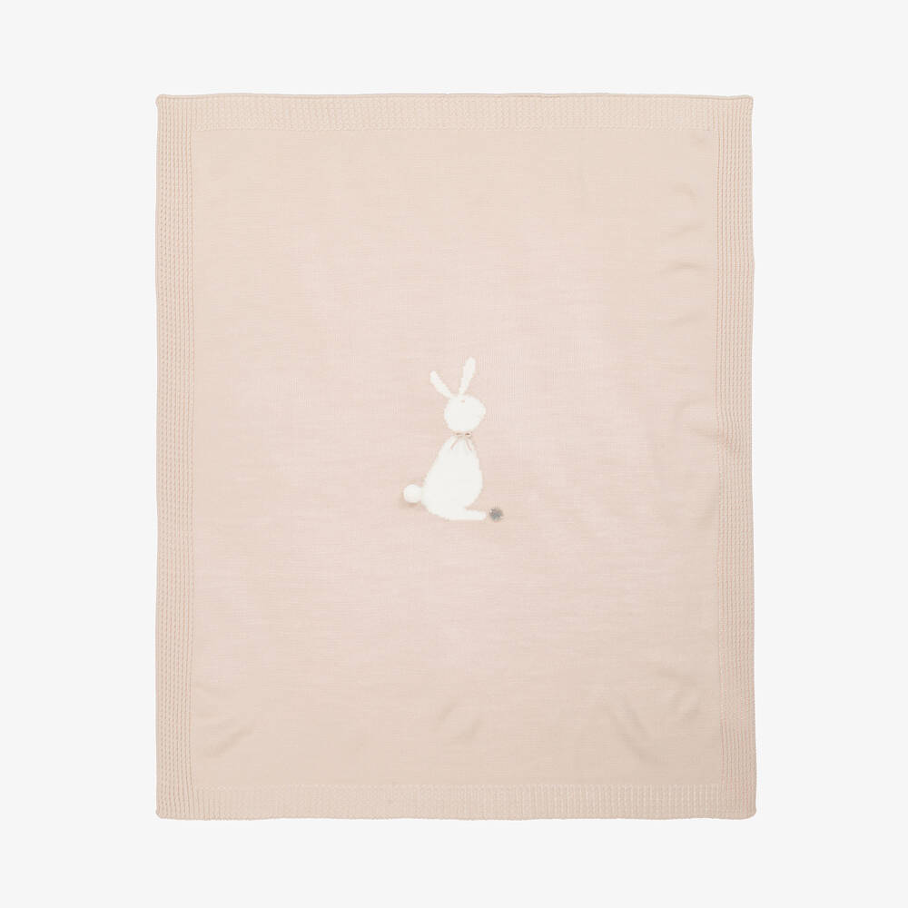 Adorable beige knitted blanket for baby boys and girls from Spanish brand, Artesanía Granlei. It has a lovely ribbed border and a cute white bunny motif at the centre, with a sweet knitted bow and a pearlescent logo charm. This versatile accessory is ideal for use in the nursery and can also be used in the car seat, pram, or stroller.