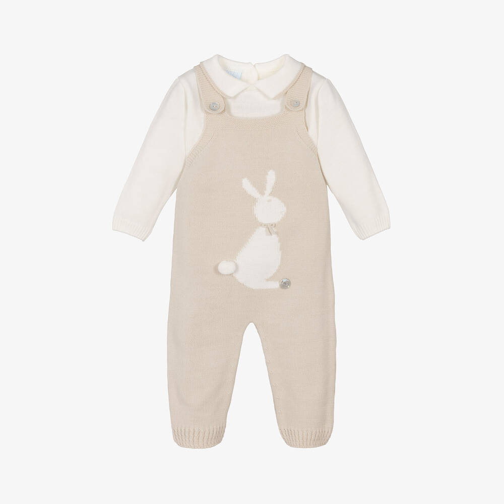 Adorable for baby boys and girls, a softly knitted top and dungaree set by Spanish brand Artesanía Granlei. The beige dungarees have a cute bunny motif with a pom-pom tail on the front, and button fastening shoulder straps. The ivory sweater has a pointed collar, ribbed trims and button fastenings on the back. Both pieces are trimmed with a mother-of-pearl logo charm, adding a signature finish to this charming outfit.