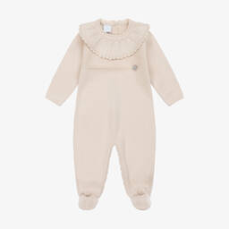 Beige knitted hat and scarf set for boys and girls by Artesanía Granlei. The hat has a garter stitch pattern with a contrast brim and a lovely faux fur pom-pom detail on the top, and the scarf has a ribbed pattern. Both pieces are trimmed with the brand's logo disc for a discreet designer finish.