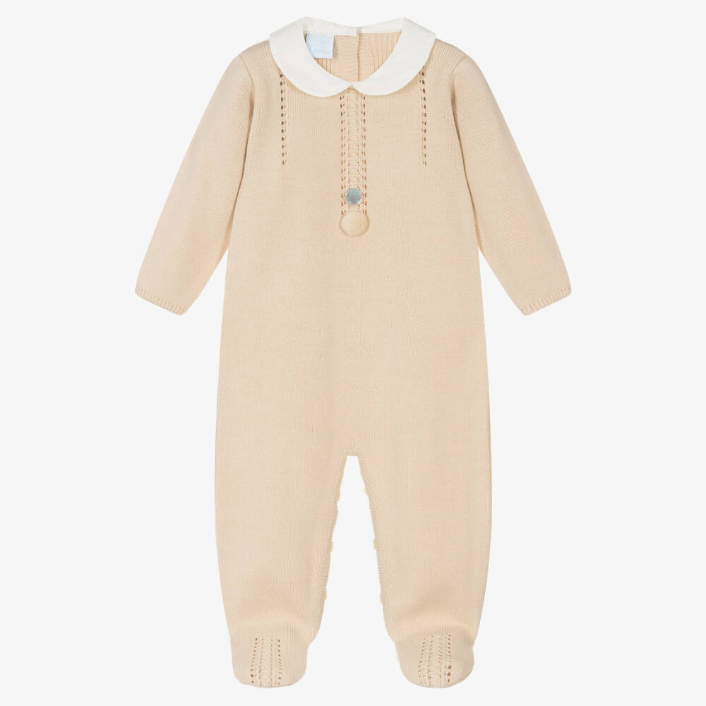 Beige babygrow for boys and girls by Spanish brand Artesanía Granlei, in a soft and cosy knit. It has delicate patterned detailing and a woven ivory Peter Pan collar for a traditional look. There is a sweet pom-pom decoration on the front, with a faux mother-of-pearl logo charm. This lovely babygrow fastens with buttons on the front and between the legs.