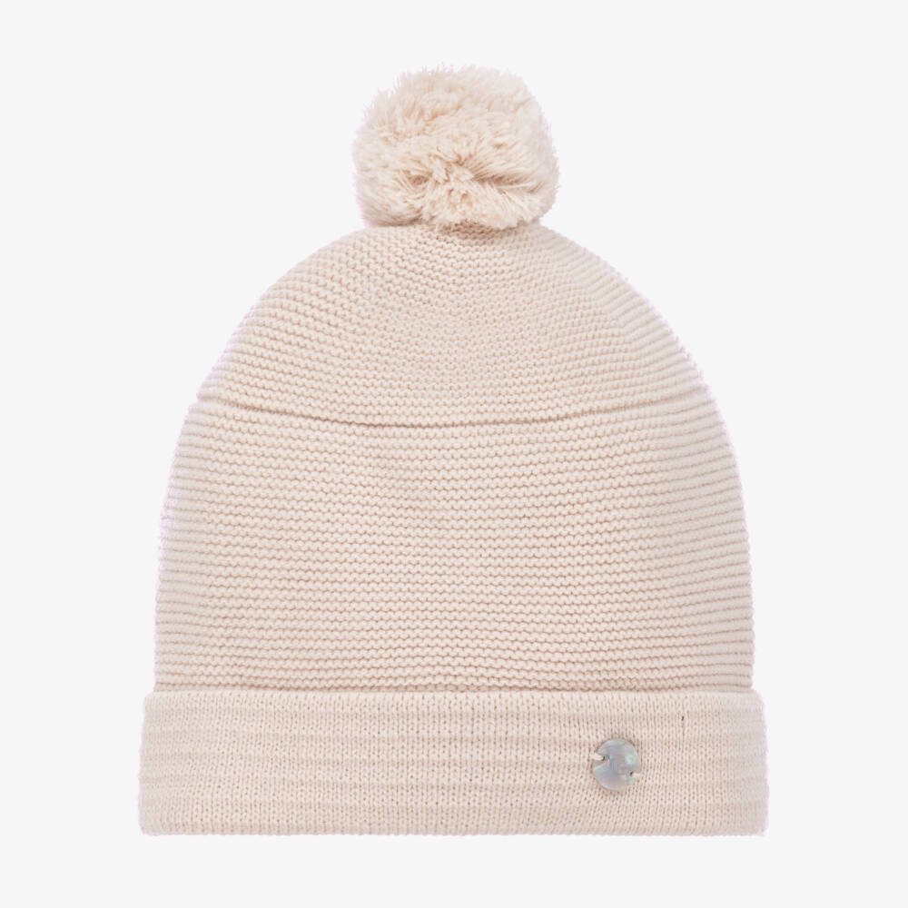 Lovely beige hat for boys and girls by Artesanía Granlei, crafted in a soft knit. Cosy and comfortable to wear, it has a sweet pom-pom on the top and a turn-up brim with a signature logo charm, for a stylish designer finish.