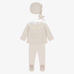A light blue and white shortie set for baby boys by Spanish brand Artesanía Granlei. Softly knitted, the long-sleeved bodice is detailed with lace knit patterns and scalloped trims. It buttons neatly on the back. The lower body is made in lightweight cotton-blend voile with a fine tulle overlay. Traditional in style, this babysuit fastens with buttons between the legs and is branded with a mother-of-pearl logo charm on the front. It comes with a matching bonnet that ties comfortably under the chin.