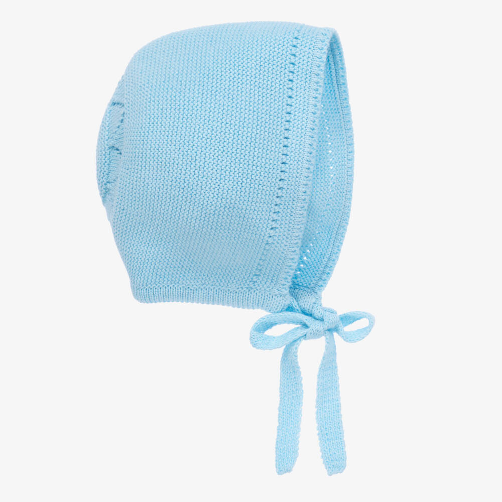 Sweet pale blue bonnet for baby boys and girls from Spanish brand, Artesanía Granlei. Knitted in a soft cotton blend, it has a simple patterned trim around the brim and a lovely floral pattern on the crown. There are knitted ties to fasten under the chin for a secure fit, and a logo charm on the side completes the look.