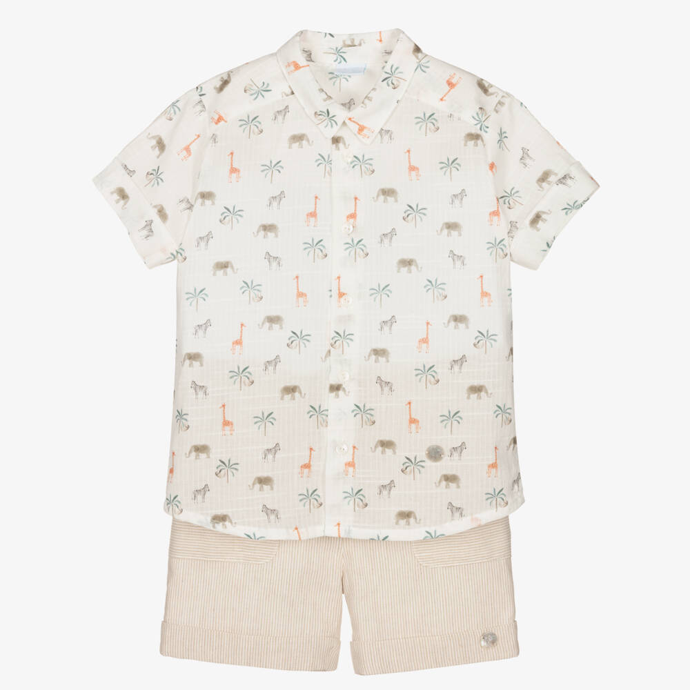 Ideal for smart-casual wear, this classic shirt and shorts set for boys is by Spanish brand Artesania Granlei. The white shirt is made in lightweight cotton and patterned in a fun animal safari print in grey, green and orange. It has a pointed collar, turned-up cuffs and front button fastenings. Made in a soft cotton and linen blend and fully lined for comfort, the beige striped shorts have turn-ups, front pockets, and fasten with a button and zip on the front.