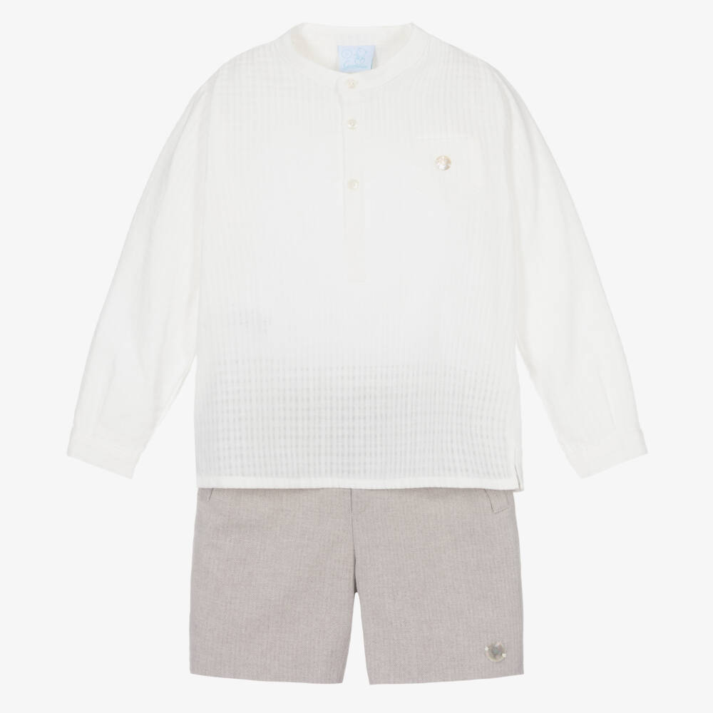 Charming smart-casual ivory and beige shorts set for boys by Spanish brand Artesanía Granlei. Woven in soft cotton with a subtle checked pattern, the collarless shirt fastens on the front with pearlescent buttons and has a small chest pocket. The beige herringbone shorts have an elasticated adjustable waist for a comfortable fit, and fastens with a button and zip at the front. They have faux pockets and decorative wooden buttons for a classic look. Both pieces are trimmed with a faux mother-of-pearl logo charm.
