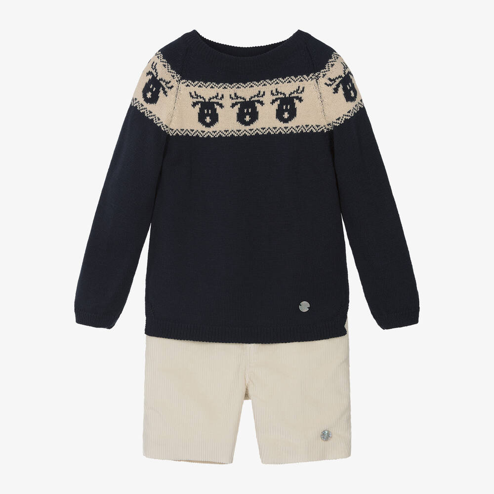 Exclusive to Childrensalon, a traditional shorts set for boys by Spanish brand Artesanía Granlei, for cooler days. The festive, navy blue sweater has an ivory, Fair Isle band around the shoulders with cute navy blue reindeer knitted into the weave. It is soft and lightweight, with long sleeves and ribbed trims. The beige cotton corduroy shorts have faux front pockets and an adjustable waistband for a comfortable fit. They fasten with a front button and zip. Both pieces have the designer's signature mother-of-pearl logo charm sewn on one side.